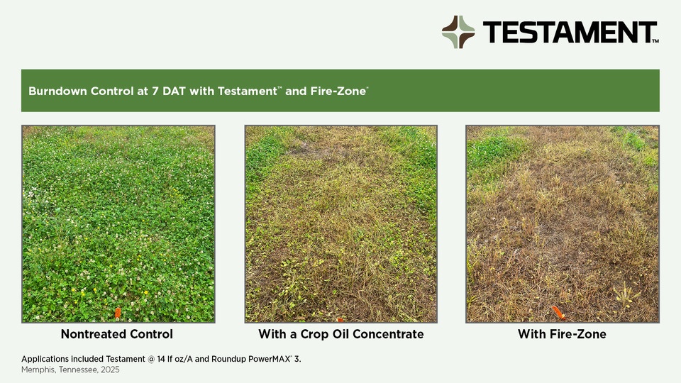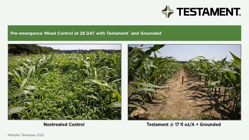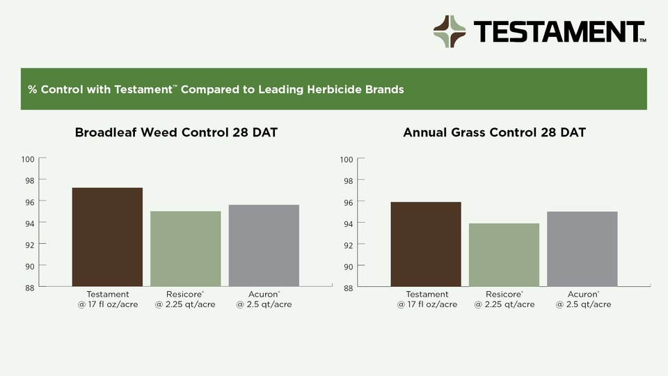 Testament creates a foundation of weed control to reduce the need for resprays and limit the amount of active ingredient in the environment over the course of the season.